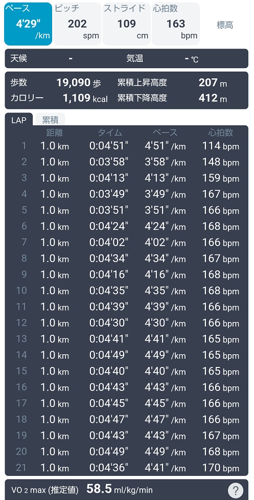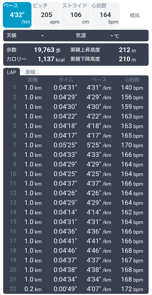 練習不足が一番の要因で、心拍数が160回/分を超えると心臓が苦しく、脚が止まりそうにきつく感じました。(←言い訳②)