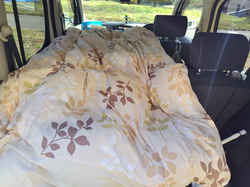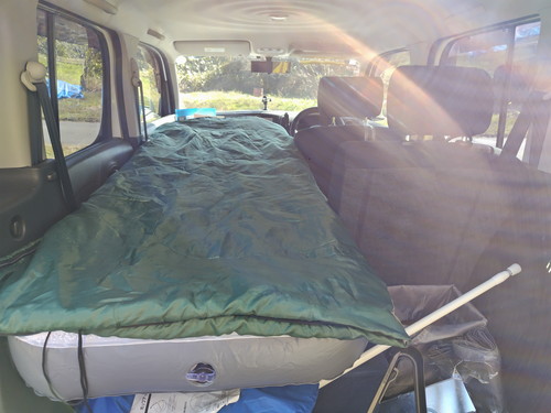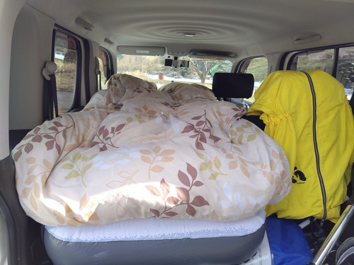 先日買ったクッションシートの上にインフレーターマットを敷き、その上に(長野県の特産品のw)長座布団(180cm)を敷布団として、その上に夏用の肌掛けをセットして、