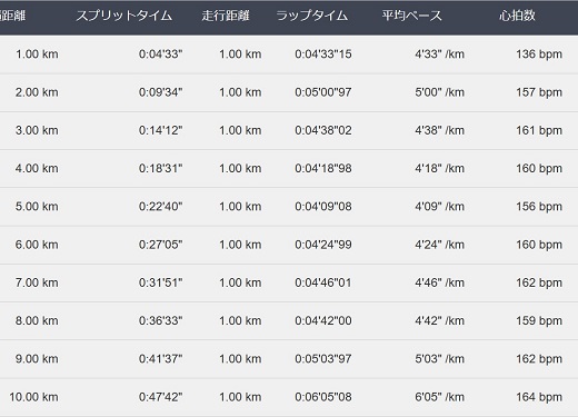 一応、自分の時計で測った、1kmごとのリザルトです。