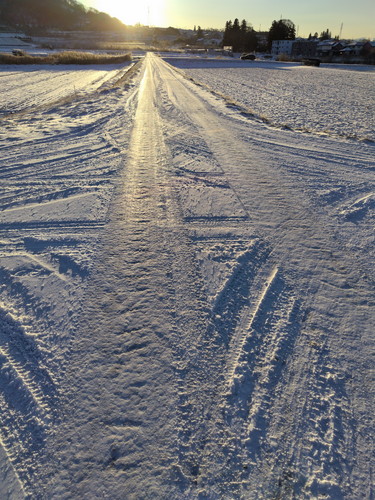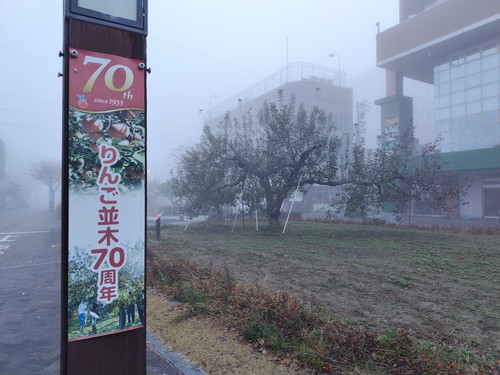 リンゴ並木の「並木道」を走り、(←この日は霧が濃くて写真がイマイチ)
