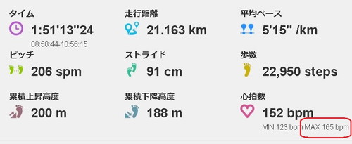 ジョグなのに心拍数がMAX165回/分まで上がるほどのきついラン。