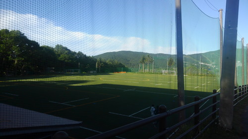 フットボールのグランドが並ぶ道沿いを駆け抜け、朝の心地いい汗を流しました。