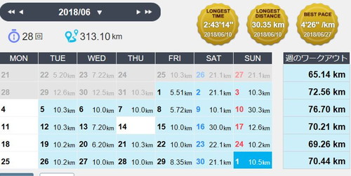 1週も毎日平日10kmを完遂できず、おさぼりの週や10km未満の日があって、月間走行距離も313kmという不甲斐なさでした。