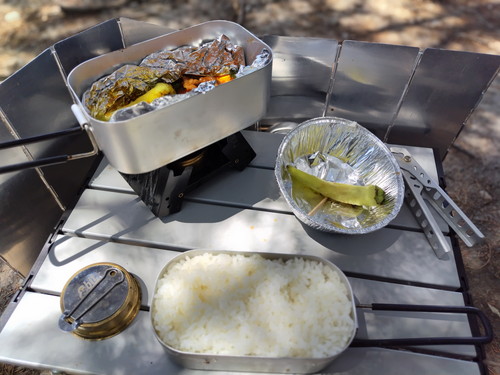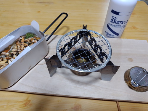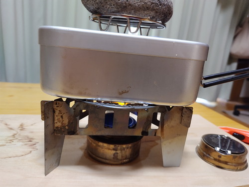 アルストを設置し、室内なのにキャンプ感満載の装備で米を炊いていきました。