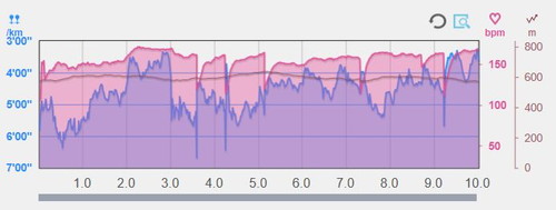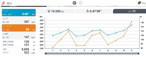 アップダウンの激しいコースなので、各ラップはバラバラですが、負荷をほぼ一定にしていますので、ペースランの位置づけです。(左端の「ペース」欄が各ラップ)