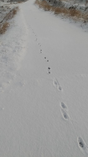キツネかタヌキが歩いた後の道をタッタカ走ってきたんですが、