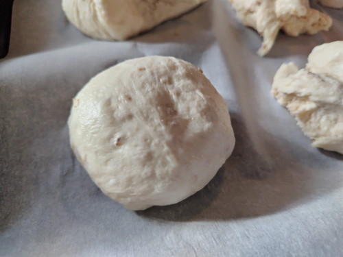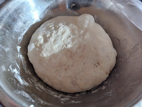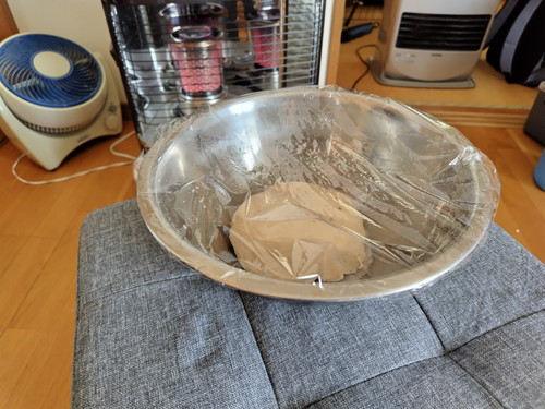 ストーブの前で、一次発酵させています。(←練りの作業は、手が粉だらけで写真はとれず)