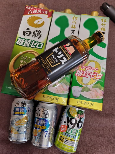 日本酒が4.5リットルとウイスキーひと瓶と酎ハイが3本あります♪